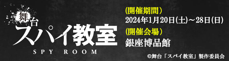 | 【応募方法】 | 以下の手順に従って、ご応募いただけます。 Twitterアカウント「スパイ教室」TVアニメ公式(@spyroom_anime)をフォロー。 「スパイ教室」TVアニメ公式(@spyroom_anime)からツイートされる該当ツイートをリツイート。 |